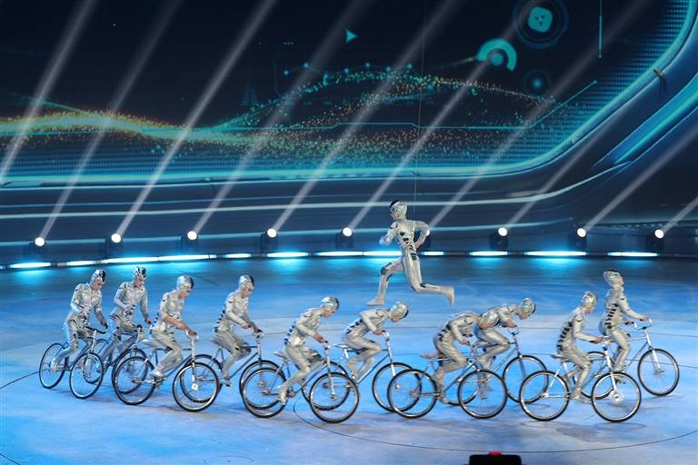 图③ 2026中国杂技大联欢节目中,演艺人员在表演女子集体车技。 刘俊涛 摄